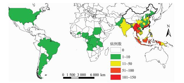 2.3 时空分布特点2016年中国大陆地区共23省112市 (区) 报告病例,较2015年[26省123市 (区)]有所下降。共4省16市报告本地病例,分别为福建省 (921例)、广东省 (416例)、云南省 (217例) 和浙江省 (8例),见图 1,较2015年 (4省28市) 有所下降。输入病例主要分布于广东省 (128例)、云南省 (108例)、福建省 (55例) 和浙江省 (50例),占全部输入病例的71.0%。输入病例来源于30个国家,较2015年 (27个国家) 更为多样化,东南亚国家占79.6%(383例),南亚国家占10.8%(51例),此外美洲、非洲和太平洋岛国也有输入病例,见图 2。