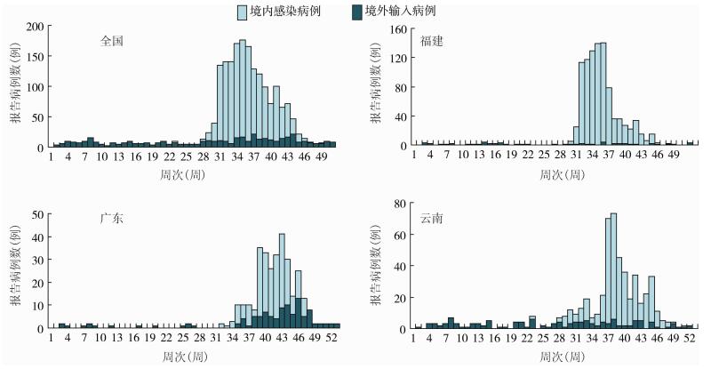 除第1周外,每周均有输入病例,波动在3~22例/周,第35—46周较为密集;首例本地病例报告于第23周,第24—27周无本地病例报告,第28—51周,每周均有本地病例报告,病例高峰集中于第32—39周,周均报告病例达133例,第40周起,病例出现较为明显的下降,见图 3。广东省、福建省均自1月起开始出现输入病例,各周分布较为均匀,云南省输入病例基本集中于8月下旬至12月。