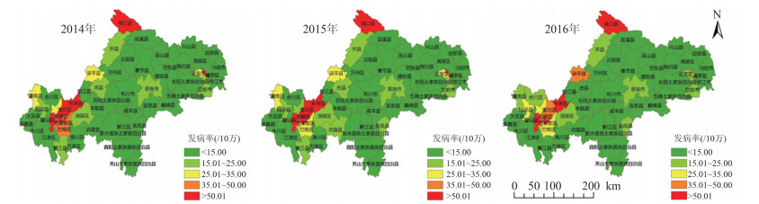 1.4 统计学分析采用Excel 2010软件进行数据整理和描述性分析,以“现住地址国标码”为链接字段,将2014-2016年三峡地区以县(区)为单位的发病数据与相应电子地图建立空间关联,构建三峡地区菌痢报告发病率GIS数据库,应用ArcGIS 10.3软件绘制发病率地图并实现分析结果的可视化。利用GeoDa 1.8.16.4软件进行全局和局部空间自相关分析,SaTScan 9.4软件进行时空扫描统计分析,P < 0.05为差异有统计学意义。