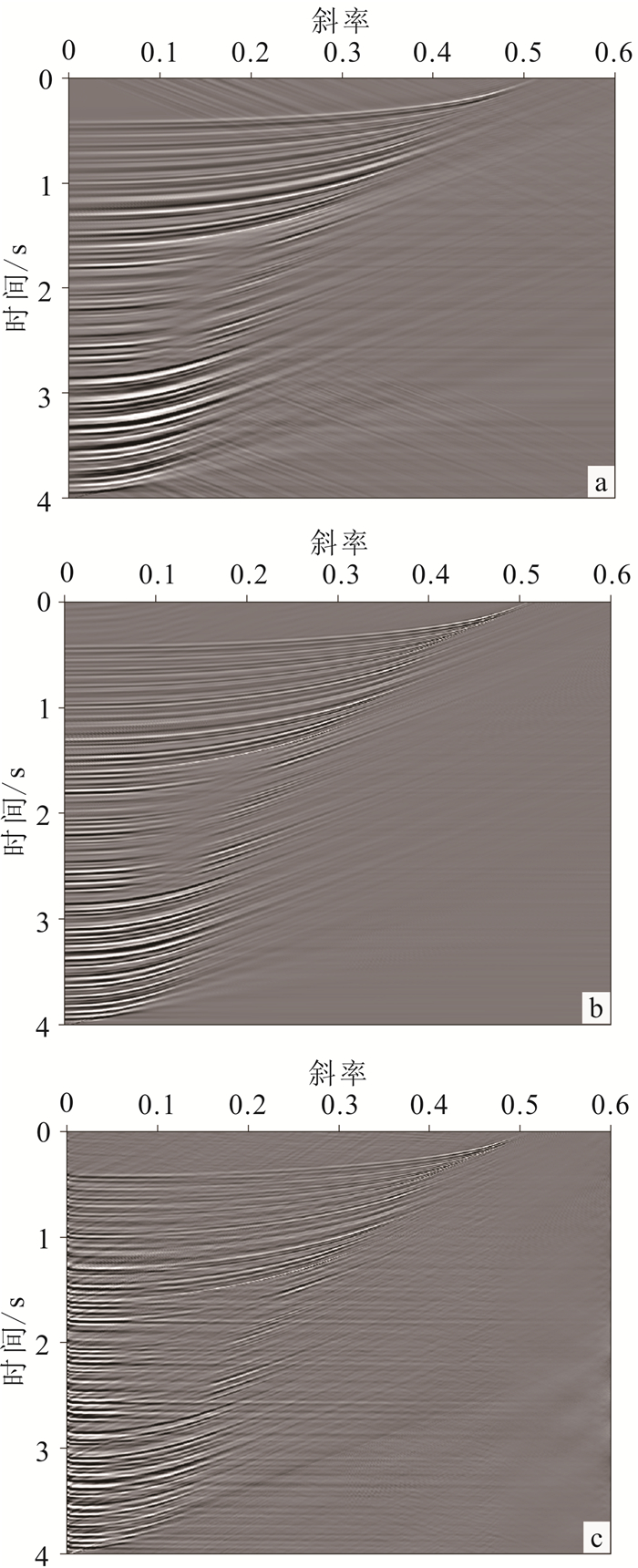 a.基于径向道变换;b.基于斜率分解;c.常规方法。 图 4 不同τ-p正变换结果对比 Fig. 4 Comparison of different forward τ-p transforms |