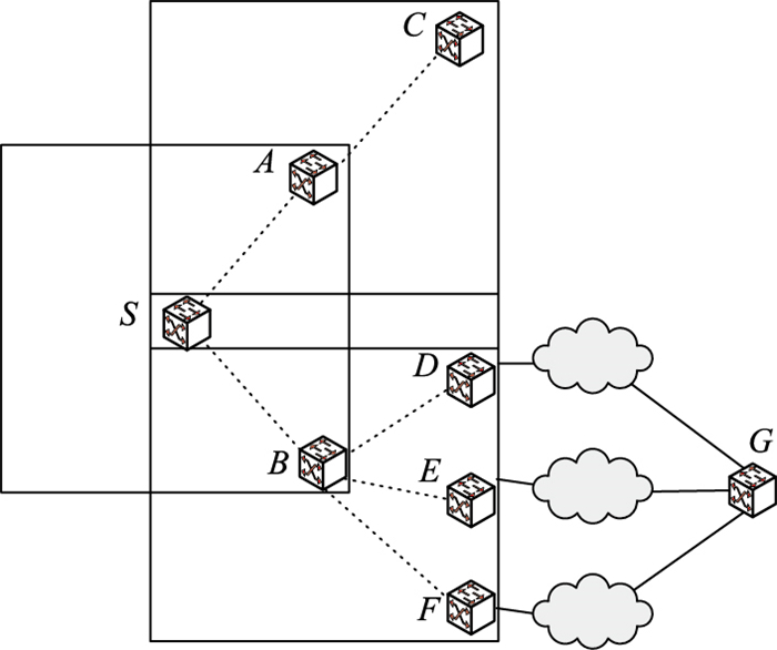 使用d表示近处代价,使用D表示远处代价或端到端代价,dSA指在以源节点S为中心的区域内按照最短路径树到达候选节点A的近处代价,图中使用虚线的原因是因为,从S到A有可能需要区域内的其他节点中转。由于目的节点C在以候选节点A为中心的区域内,所以DAC=dAC。若源节点S要发送数据包到目的节点G,如果候选节点B被选为中继节点,则路径S→B→G包括两个部分,以源节点S为中心的区域内路径dSB,以及候选节点B到达目的节点G的远处代价DBG,由于目的节点G不在以候选节点B为中心的区域内,要获得DBG,我们需要综合考虑从候选节点B到目的节点G所有的潜在路径B→D→G,B→E→G与B→F→G。