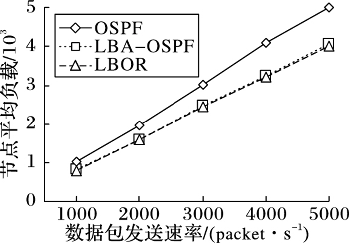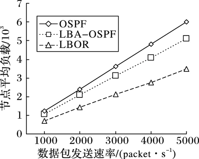 在更实际的网络场景中,网络中会随机产生多条数据流。在这种情况下,一些位置比较关键的节点,如OSPF区域的边界结点,将会承担多条流的汇聚流量,造成过大的负载压力,影响路由的性能。图 5描述了在多条流的网络场景下,节点的平均负载随数据包发送速率增大的变化趋势。在这种场景下,LBOR相对于LBA-OSPF与OSPF的性能优势比单条流的场景下更加明显,节点的平均负载分别降低了32.3%与41.7%;并且随着数据包发送速率的增大性能提升更加显著。LBA-OSPF虽然有着一定的负载均衡的能力,但在跨区域传输时仍然需要先将数据包转发到区域的边界节点,在数据量较大时边界节点仍然会成为网络的瓶颈。上述结果验证了LBOR有较强的负载均衡的能力,在处理多条流的实际网络场景时有更好的适应性。
