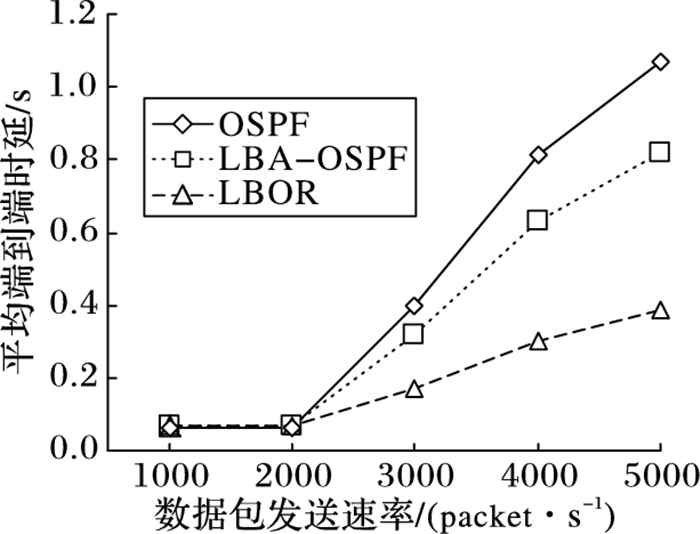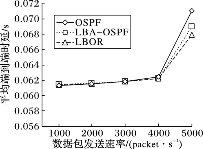 图 4描述了当数据包的发送速率增大时,平均的端到端时延如何变化。当数据包的发送速率较小时,网络中的流量较小,这时候三种路由协议的端到端时延性能差别不大,但当数据包发送速率持续增大时,链路与路由器的处理能力受到更严峻的挑战,更多的排队时延的引入会导致端到端时延的增加。LBOR协议与传统的OSPF协议相比,可以将数据包均衡在多条潜在的转发路径上,有效地避免确定性路由单一转发节点的大量排队时延的问题,在高流量时有更小的端到端时延。与LBA-OSPF协议相比,LBOR有着一定的性能提升。