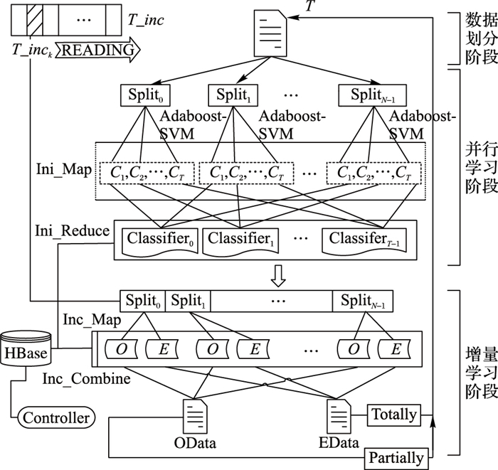 从Controller组件的ControllerClassifier字段中获取上一阶段的组合分类器参数p。如图 1增量学习阶段所示,在每个Map过程中,利用参数p将分为增量数据分片分为正确分类样本O和错误分类样本E两类,并按照1.1.2节中的规则2调整权重。为减少Map和Reduce之间的数据传输,声明Combine任务融合Map输出结果,得到本轮计算得到的准确分类样本集Ei和错误分类样本集Oi。Controller组件为每个Combine分配在HBase唯一的端口号和存储空间。Combine对应的行拥有两个字段Edata和Odata,分别存放错误分类样本集和正确分类样本集。Combine任务将数据结果上传到HBase中以该ID编号为Rowkey的行的Edata字段和Odata字段中。Controller监控HBase中所有ID编号行的Flag字段,当所有的该字段全部为1时,ControllerFlag字段设置为INCi,表示对增量样本的处理完成,开始进行第i+1次迭代。跳转到并行学习阶段,根据权值调整新一轮训练样本的规模。