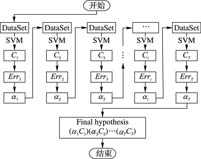 1.1 关键部件设计分析 1.1.1 集成学习集成学习利用特定规则将多个学习结果进行组合从而获得比单个学习器更好的学习效果。集成学习思想普遍应用于分类问题。在以下3个场景时集成学习机制较为适用:其一, 当数据量过大难以被单个分类器所处理时,集成可以让每个分类器处理一个分区的数据,最后将其分类结果进行融合。其二,机器学习算法通常需要足够的、有代表性的数据来生成一个有效的模型。如果数据规模很小,集成学习可以通过对原始训练数据进行重叠随机采样来扩充训练数据。其三,当决策平面较为复杂时,很难用单个分类器完整描述时,分类边界被近似成弱分类器的组合会是一个很好的选择。Adaboost是常见的集成算法,如图 2所示,通过在迭代训练过程中不断调整样本的权重,计算误差率Err并根据误差率更新局部分类器话语权α。如图 1所示,本文采用Adaboost-SVM算法作为并行的基础分类算法在Hadoop平台上并行实现,算法的输入为Split数据分片,在T轮迭代后得到T个带有话语权的局部弱分类器C1, C2, …, CT。