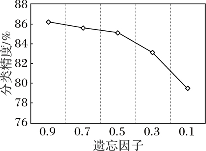 遗忘因子作为参数用于在增量学习过程中调整内样本和准边界样本在训练样本中的规模。设遗忘因子为∂(0 < ∂ < 1),若内样本和准边界样本点总数为N,按照样本的权值进行降序排序,选取权值排名前∂N个样本数据加入到新一轮训练样本中,利用遗忘因子和样本权值有选择地淘汰对分类面建立影响较小的样本,有效减小训练样本规模。