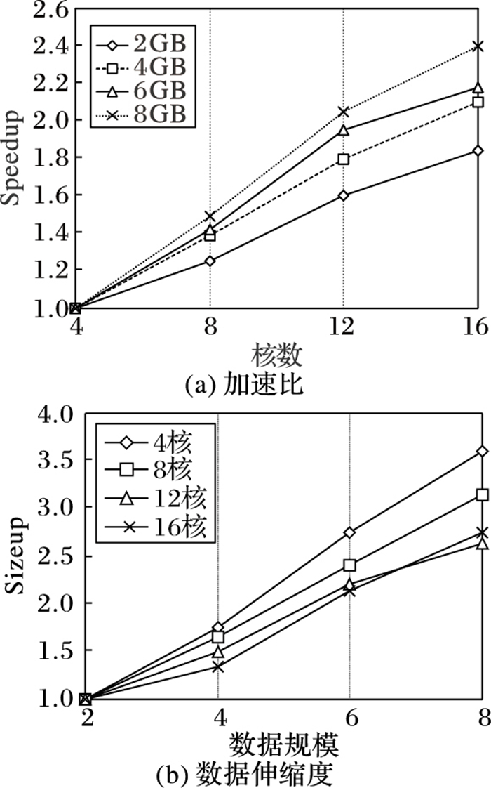 数据伸缩度通常被定义为在m*数据块(Data Block, DB)数据上面训练所用时间与在DB数据上面训练所用时间之比,衡量了算法处理不同规模训练数据的算法时间复杂度。实验中,本文将计算机核数分别固定为4、8、12、16,将训练数据从2 GB增加至8 GB。如图 4(b)可知,当数据规模为2 GB时,单节点系统的Sizeup值大约为1.7,而4节点系统的Sizeup值为1.25,差距并不明显,当随着数据规模的大幅度增加,4节点对应的Sizeup增长率明显低于单节点系统的Sizeup增长率,算法复杂度上单节点和多节点的差距越发明显。再者,由计算节点为4时的数据伸缩度曲线可知,当数据规模4GB附近曲线出现拐点,数据规模较小时,曲线变化较为平缓,但随着数据的增加,负载均衡和I/O通信等额外开销增加,曲线变得陡峭,但随着数据的持续增长又逐渐趋于平缓,可见PIASVM算法框架拥有很好的数据伸缩度表现。
