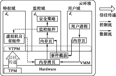 这些方案有效地推进了云服务可信的快速发展。但由于云环境的复杂性,在底层资源之上通常运行着管理域与大量用户域,域的可信度量难以实时、准确。其次在管理域上的监控与信任度量机制对用户域也存在着特权的安全威胁,因此还需要增加更加安全高效的安全机制来保证云服务的安全可信。