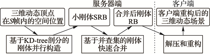图 1给出本文基于KD-tree剖分的三维动态场景快速压缩算法的整体流程。以三维场景中所有模型顶点在S帧运动中的三维空间位置为输入,首先在第0帧对整个三维动态场景进行KD-tree剖分,并对剖分后包含大于三个顶点的叶子节点并行构造刚体得到小刚体(Small Rigid Body, SRB);然后建立包含刚体的叶子节点和均匀划分的三维网格之间的映射关系,使用并查集将并行构造的小刚体快速合并得到刚体(Rigid Body, RB),并将不能合并到刚体的顶点,即散点(Unassigned Vertex, UV)进行压缩,有效降低网络带宽的限制;最后将压缩后的数据包传输到客户端,解压并重构三维动态场景。