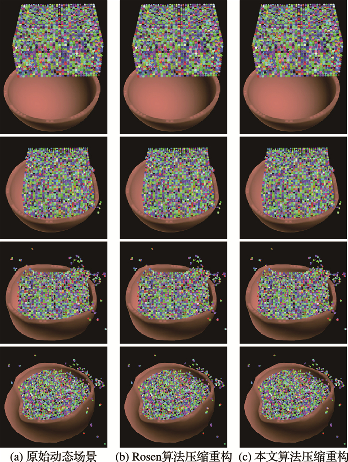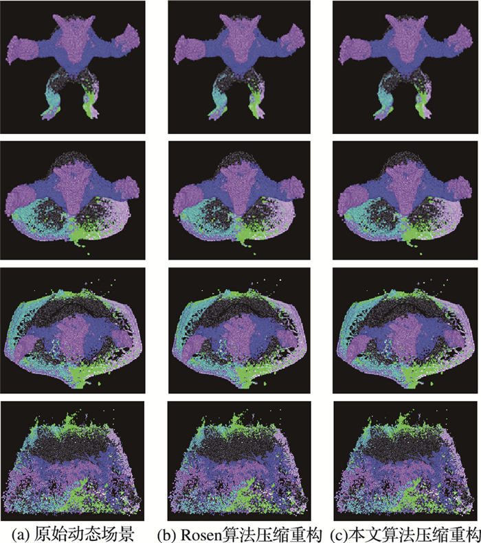 表 2给出了不同误差阈值时本文算法同Rosen算法顶点平均误差的比较。场景误差中的相对误差是用户定义的误差阈值和相应场景AABB中最大数值的比值;平均误差是所有顶点在整个运动过程中的原始空间位置和重构空间位置之差的平均值;误差比值是本文算法同Rosen算法的平均误差比值。从表中可看出,本文算法的平均误差比Rosen的小,主要原因是由于对散的顶点的压缩。Rosen通过获取顶点在关键帧的空间位置,然后通过线性插值的方式重构顶点的运动轨迹。而本文算法通过存储散点的原始空间位置或使用其所在刚体的运动矩阵得到运动轨迹,从而减小了顶点三维空间位置的重构误差。但因此最后的压缩比,相比Rosen算法会稍微有点降低(表 3中压缩结果)。