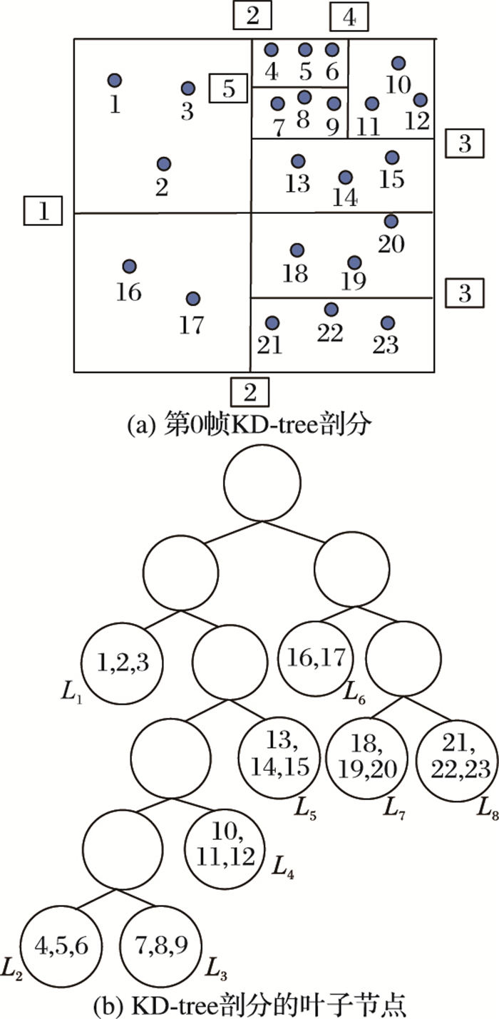 2.1 三维动态场景的KD-tree剖分基于KD-tree划分的刚体并行构造,首先是对整个三维动态场景在第0帧建立轴对齐包围盒(Axis Aligned Bounding Box, AABB)进行KD-tree剖分,直到每个叶子节点所包含顶点数目小于等于用户自定义阈值(一般是3至15的任一值)或达到划分深度。在图 2中以二维为例,介绍KD-tree剖分过程及结果。假定KD-tree剖分后,每个叶子节点所包含顶点个数不能超过3个,即剖分过程中一旦叶子节点所包含顶点个数小于等于3,则停止剖分。图 2(a)小圆圈点表示场景所含的顶点,图中数字表示第几次剖分。第1次剖分是分为上下两部分,由于上下所包含顶点个数大于3,因此进行第2次剖分。第2次剖分后,上下两部分的左侧所包含顶点个数小于等于3,因此不再进行剖分,而是对上下两部分的右侧进行第3次剖分。直到第5次剖分,满足每个叶子节点所包含顶点个数都小于等于3。图 2(b)是三维动态场景在第0帧进行KD-tree剖分后的叶子节点示意图。