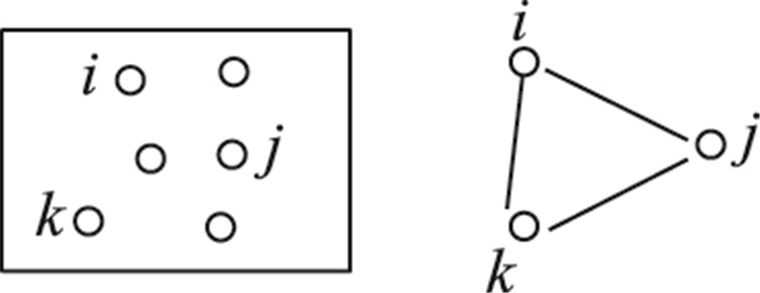 如图 3所示,假定KD-tree剖分后某个包含M(M≥3)个顶点的叶子节点,对于其包含的任意一顶点i,要找到满足条件的其他两个顶点j和k来构造初始小刚体,并计算初始小刚体的运动矩阵Q。