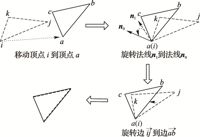 构造初始刚体(i, j, k)后,求初始小刚体具体某一帧相对于第0帧的运动矩阵。具体如图 4:假定初始小刚体(i, j, k)在运动过程某一帧f时的空间位置为(a, b, c),首先将顶点i移动到第f帧对应的空间位置a上,得到移动矩阵Q1;然后将三角形(i, j, k)的法线n1旋转到第f帧三角形(a, b, c)的法线位置n0,得到旋转矩阵Q2;最后将三角形(i, j, k)的边(i, j)旋转到(a, b),得到旋转矩阵Q3。第f帧相对于第0帧的运动矩阵q f,即Q1、Q2和Q3的相乘,用式(1)表示为: