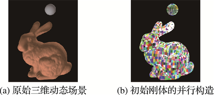 图 5给出了三维动态场景在第0帧基于KD-tree剖分后并行构造刚体的效果图:图 5(a)是原始三维场景,图 5(b)中每一个小刚体用一种随机颜色来表示,不能构造刚体以及不能合并到刚体中的顶点(散点)用白色表示。如兔子耳朵上的顶点,由于兔子在和小球碰撞过程中变化比较剧烈,无法构造或合并到某个小刚体中,从而成为散点。