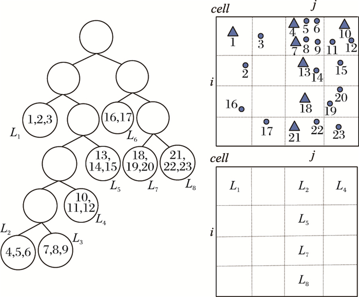 图 6二维显示基于KD-tree剖分并行构造的刚体与均匀剖分网格之间映射关系的建立:左侧刚体叶子节点L1所包含的第一个顶点在中间均匀剖分的网格cell(1, 1)中,因此均匀网格cell(1, 1)所映射的刚体叶子节点为L1;同理,cell(1, 4)、cell(2, 3)、cell(3, 3)和cell(4, 3)分别映射刚体叶子节点L4、L5、L7和L8;刚体叶子节点L2和L3的第一顶点均在均匀网格cell(1, 3)中,因此都可映射到均匀网格cell(1, 3)。但一个均匀网格只允许映射一个刚体叶子节点,cell(1, 3)和L2建立映射关系后,判断L3所包含的刚体是否能合并到cell(1, 3)所映射的叶子节点L2所包含的刚体中:如能合并,则L2刚体中增加L3刚体所包含的顶点;如不能合并,则L3刚体所包含的顶点变为散点。式(2)和(3)判断一个顶点是否能合并到某一刚体中,如果判断一个刚体能合并到另一刚体,则要保证刚体所包含的所有顶点都能合并到另一刚体中。