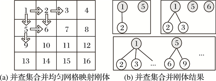 图 7(a)中,首先将所有能映射刚体的网格的父节点定义为本身,然后进行基于并查集的刚体合并:从cell1开始遍历,向右向下看cell2的srb2和cell5的srb5是否能合并到cell1的srb1。首先看srb2,如Merge()返回true,则srb2合并到srb1,并依据并查集合并规则将cell1作为cell2的父节点(图 7(b)第1行左,父节点为圆圈1);刚体srb5不能合并,则保留不动。继续遍历cell2,向右向下看cell3的srb3和cell6的srb6是否能合并到cell2的srb2,依据并查集的合并规则,判断是否能合并到cell2父节点中的刚体srb1。假定srb3合并到srb1,则将cell1作为cell3的父节点;srb6不能合并,继续保留(图 7(b)第1行右)。遍历到cell5,假定cell6的srb6和cell9的srb9能合并到srb5,则cell5成为cell6和cell9的父节点。遍历完所有均匀网格后,图 7(b)中所显示的树形第一层圆圈刚体即是基于并查集合并后的刚体。