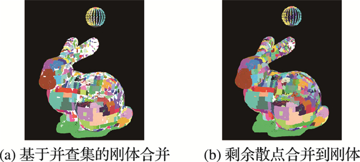 完成刚体的构造以及合并后,需要对剩余散点进行压缩,以进一步提高压缩比。散点压缩是使用式(2)和(3)将剩余散点向并查集合并后的刚体中合并,图 9给出了散点合并到刚体后的效果图。与图 9(a)未合并前相比,图 9(b)中兔子的耳朵和后背的一些散点(白色顶点)被合并到刚体中,提高了动态数据的压缩比。