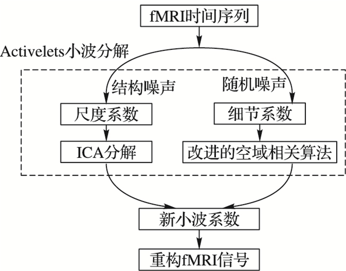 1 本文算法本文算法基于原始fMRI信号模型,在小波域对原始fMRI信号进行滤波,具体流程见图 1。总体而言,由于考虑到两类噪声在小波域的不同特点:结构噪声的能量主要集中在尺度系数上,而随机噪声主要集中在细节系数,本文通过选择Activelets小波基分解体素时间序列后,分别对这两类系数进行处理。