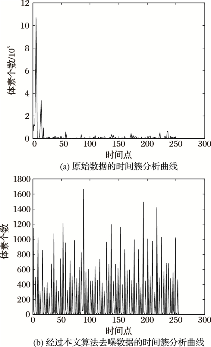 时间簇分析是一种对噪声异常敏感的分析方法,图 3(a)为未经去噪处理数据的时间簇分析曲线,图 3(b)为使用本文算法去噪后的时间簇曲线。从图 3(a)中可以看出,在扫描的前几个时间序列中,由于被试并未适应实验环境,头动较为严重。而由于头动结构噪声的影响,原始信号的时间簇分析曲线能量主要集中在前几个时间点,大脑响应的刺激不明显。而图 3(b)所示的脑区刺激,虽然在几个时间点仍然受到结构噪声影响,但尖峰信号明显减弱,其对大脑响应刺激的观测要明显优于处理前所示, 这也说明了使用基于小波变换的分步去噪算法的优越性。