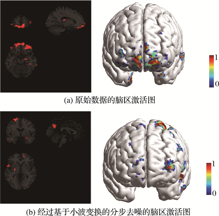 图 4 去噪前后脑区激活图比较 |