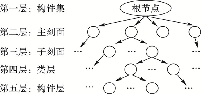 2 构件聚类树 2.1 构件聚类树的结构聚类树是一种数据集聚类分层表示的树结构[14-15]。聚类树将数据划分为层次结构, 从而成为一个高效检索的索引结构。本文中的构件聚类树是一棵非空的5层结构的聚类树, 其结构如图 2所示。