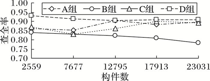 实验结果表明,构件库的规模增大后, 本文算法的查准率和查全率仍在87%以上, F-measure值保持在0.90左右, 比其他三种算法的检索结果要好; 而且查询响应时间的增加在对数级别以下。所以,本文方法是行之有效的, 而且拥有较好的检索效果, 同时也可在规模较大的构件库中使用。