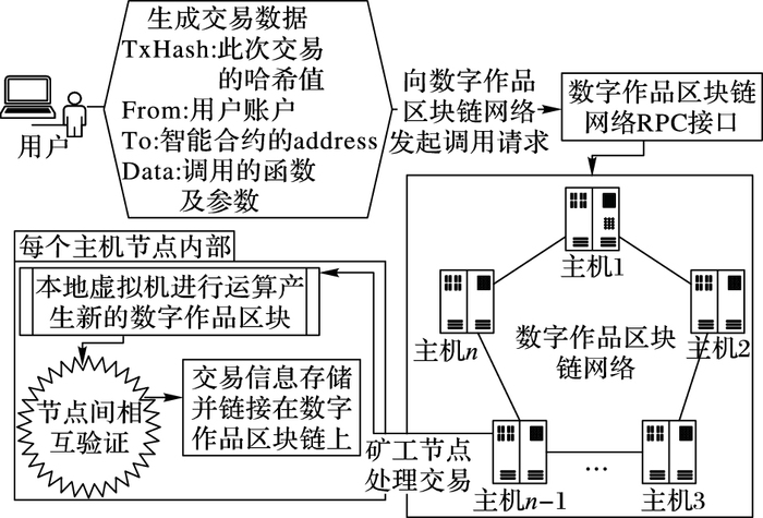 1) 用户使用客户端发起交易。用户在客户端的操作数据会生成一笔交易数据,由客户端将这笔数据通过区块链网络的远程过程调用协议(Remote Procedure Call protocol, RPC)接口,发送到数字作品区块链网络中,调用已部署的智能合约来完成版权登记、查询或转让功能。