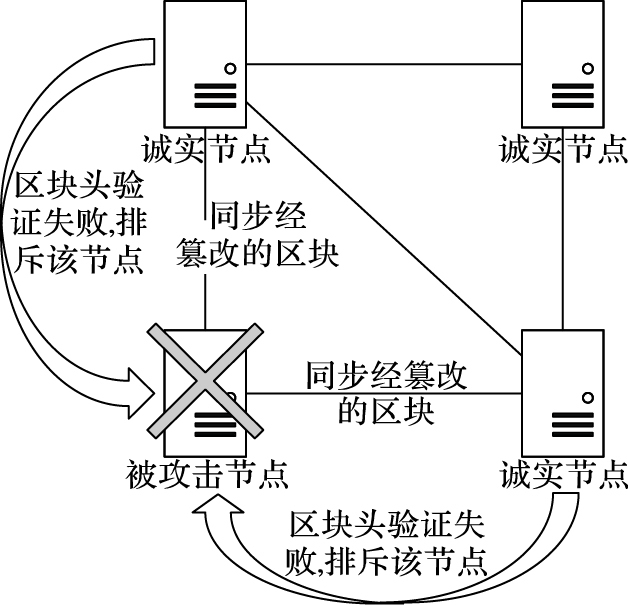 而本文模型采用去中心化的架构模式使得区块信息由网络中的节点共同维护, 即使黑客控制了区块链网络中的有限个节点,也不会影响该系统模型的正常运作; 而且区块链中的数据信息经过了私钥加密,进而保证了数据的机密性。如图 10所示,如果黑客对区块信息进行篡改,由于区块头验证非法,被攻击节点会被其他诚实节点排斥。这样的机制抵制了所有针对传统数据存储模式的攻击。