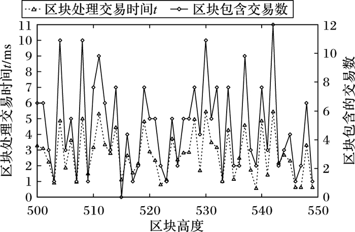 其中:n为已打包交易的区块数,ti为第i个区块计算所消耗的时间,si为第i个区块所包含的交易数。根据实验得到的区块处理交易速度与包含交易数的关系,如图 11所示。可以算出该模型每秒平均交易数为1536.8,峰值交易速度为每秒2152.4,吞吐量已经足够支撑现有平台的运作。