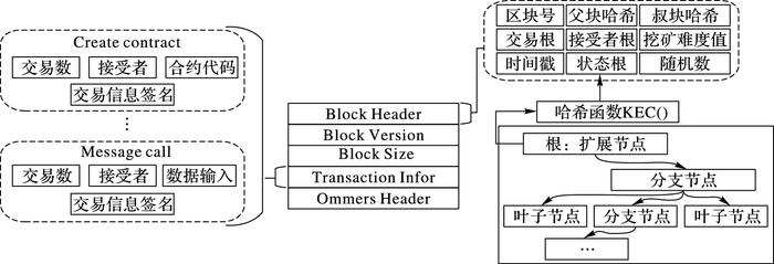 当Tt表示交易接收方的账户地址不为空时,表明交易的类型是通过已部署的智能合约产生消息调用,Tt为20个字节的地址哈希值,Td为调用智能合约接口数据的字节数组。