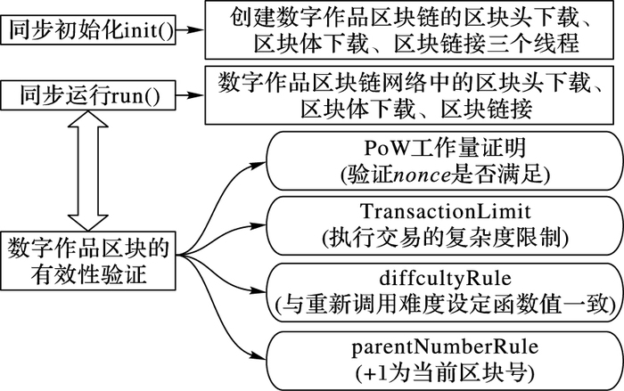 如图 6所示,数字作品区块的同步分为两大阶段:初始化和运行。在运行阶段,对同步的数字作品区块进行一些验证,包括:交易验证、区块头验证和工作量证明验证。图 6展示常规的验证项。