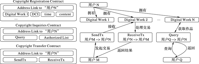 2.3 基于智能合约的版权管控协议本文模型设计了以智能合约为驱动的版权管控协议,该协议主要由版权登记合约(Copyright Registration Contract, CRC)、版权查询合约(Copyright Inquiry Contract, CIC)、版权转让合约(Copyright Transfer Contract, CTC)三个部分构成。