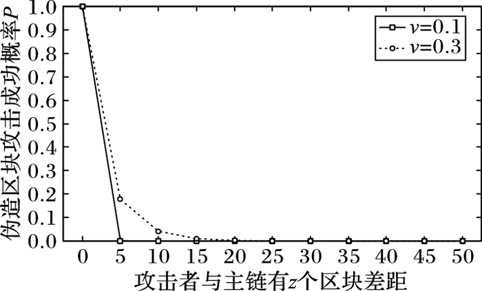 通过对ν=0.1和ν=0.3两种概率进行仿真实验,可以得到伪造区块攻击概率P和攻击者与主链区块差距z之间的关系,如表 1所示。