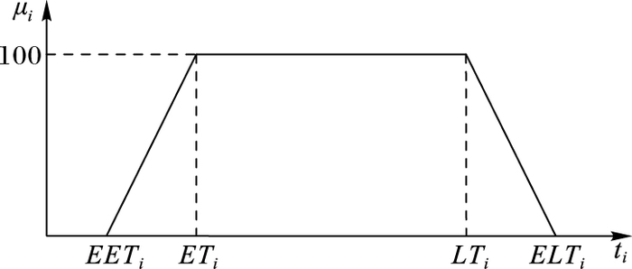 | ${\mu _i}\left( {{t_i}} \right) = \left\{ \begin{array}{l} \frac{{{t_i} - EE{T_i}}}{{E{T_i} - EE{T_i}}} \times 100,\;\;\;\;\;\;{t_i} \in \left[ {EE{T_i},E{T_i}} \right]\\ 100,{\kern 1pt} {\kern 1pt} {\kern 1pt} {\kern 1pt} {\kern 1pt} {\kern 1pt} {\kern 1pt} {\kern 1pt} {\kern 1pt} {\kern 1pt} {\kern 1pt} {\kern 1pt} {\kern 1pt} {\kern 1pt} {\kern 1pt} {\kern 1pt} {\kern 1pt} {\kern 1pt} {\kern 1pt} {\kern 1pt} {\kern 1pt} {\kern 1pt} {\kern 1pt} {\kern 1pt} {\kern 1pt} {\kern 1pt} {\kern 1pt} {\kern 1pt} {\kern 1pt} {\kern 1pt} {\kern 1pt} {\kern 1pt} {\kern 1pt} {\kern 1pt} {\kern 1pt} {\kern 1pt} \;\;\;\;\;\;\;\;\;\;\;\;{t_i} \in \left[ {E{T_i},L{T_i}} \right]\\ \frac{{EL{T_i} - {t_i}}}{{EL{T_i} - L{T_i}}} \times 100,\;\;\;\;\;\;{t_i} \in \left[ {L{T_i},EL{T_i}} \right]\\ 0,{\kern 1pt} {\kern 1pt} {\kern 1pt} {\kern 1pt} {\kern 1pt} {\kern 1pt} {\kern 1pt} {\kern 1pt} {\kern 1pt} {\kern 1pt} {\kern 1pt} {\kern 1pt} {\kern 1pt} {\kern 1pt} {\kern 1pt} {\kern 1pt} {\kern 1pt} {\kern 1pt} {\kern 1pt} {\kern 1pt} {\kern 1pt} {\kern 1pt} {\kern 1pt} {\kern 1pt} {\kern 1pt} {\kern 1pt} {\kern 1pt} {\kern 1pt} {\kern 1pt} {\kern 1pt} {\kern 1pt} {\kern 1pt} {\kern 1pt} {\kern 1pt} {\kern 1pt} {\kern 1pt} {\kern 1pt} {\kern 1pt} {\kern 1pt} {\kern 1pt} {\kern 1pt} {\kern 1pt} {\kern 1pt} {\kern 1pt} \;\;\;\;\;\;\;\;\;\;\;\;{\kern 1pt} {\kern 1pt} {t_i} \notin \left[ {EE{T_i},EL{T_i}} \right] \end{array} \right.$ | (4) |