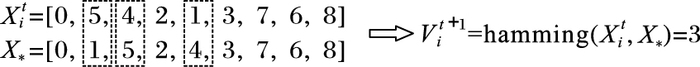 2.2 改进混合蝙蝠算法的设计 2.2.1 经典蝙蝠算法的简化经典蝙蝠算法最初用于求解连续型函数优化,而车辆路径问题等实际应用工程问题大多都是组合优化问题,为了使蝙蝠算法在解决组合优化问题时有较好的运算效率,本文采用基于客户编号的编码方式对个体进行编码。且对蝙蝠算法中蝙蝠速度的更新方式作出简化,以编号1~8的客户为例进行编码为例,求出蝙蝠与当前最优解之间对应位不同的数量即汉明距离,作为蝙蝠下一次飞行的速度,过程如图 2所示。