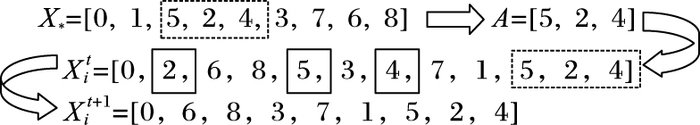 蝙蝠算法对当前最佳位置扰动产生新位置完成局部搜索,这使得进化过程由单一个体引导,容易造成群体多样性不足。在求解组合优化问题时,这种缺陷体现为蝙蝠个体之间与精英个体(最优解)之间的群体智能作用表现不明显,因此,引入精英片段保留策略,以编号1~8的客户为例,基本操作为:X*为精英个体,随机截取编码序列片段A,将精英片段A接入Xit编码尾部,同时将原Xit中与A重复的客户编码删除,得到基于精英的新蝙蝠个体Xit+1,过程如图 3所示。