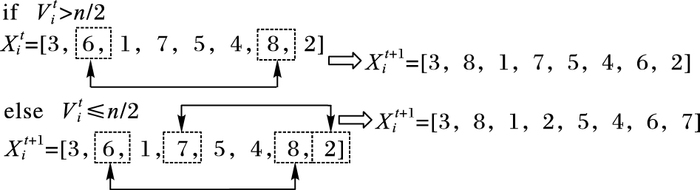 为了蝙蝠个体能够有效地进行邻域搜索,使得在当前蝙蝠种群的最优个体搜寻到更好的解,本文设计出单亲遗传选择性单、多点变异操作,用最优解对每个蝙蝠个体进行引导,最优个体也随着进化的进行不断更新,种群在多个精英个体领导下,可以避免陷入局部最优。同样以编号为1~8的客户为例,首先求出当前蝙蝠与最优蝙蝠之间的汉明距离:如果汉明距离大于n/2,随机选出当前蝙蝠的一对位点,交换对位点上的解完成单点变异操作;如果汉明距离小于等于n/2,随机选出当前蝙蝠解的两对位点,交换对位点上的解完成多点变异操作。选择性变异策略过程如图 4所示。