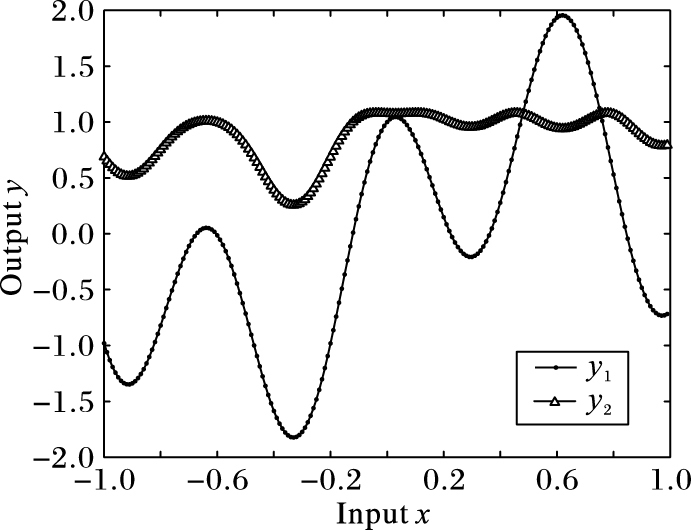 其中:x为样本的输入,y1、y2为相互关联的二维输出。以0.01为间隔,根据式(19) 从-1到1共产生200个样本点。其中前150个点作为训练数据,后50个点作为测试数据,选取C为10,ε为0.1。样本数据的分布如图 1所示。