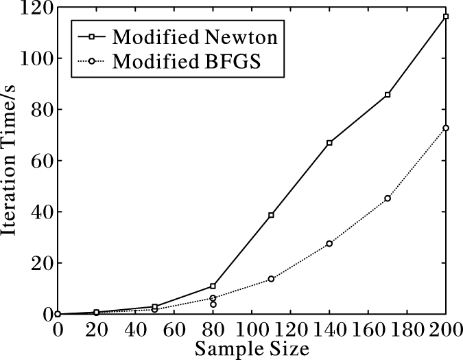 图 3 修正BFGS算法与修正牛顿法迭代时间比较 Figure 3 Iteration time comparison between modified BFGS algorithm and modified Newton method |