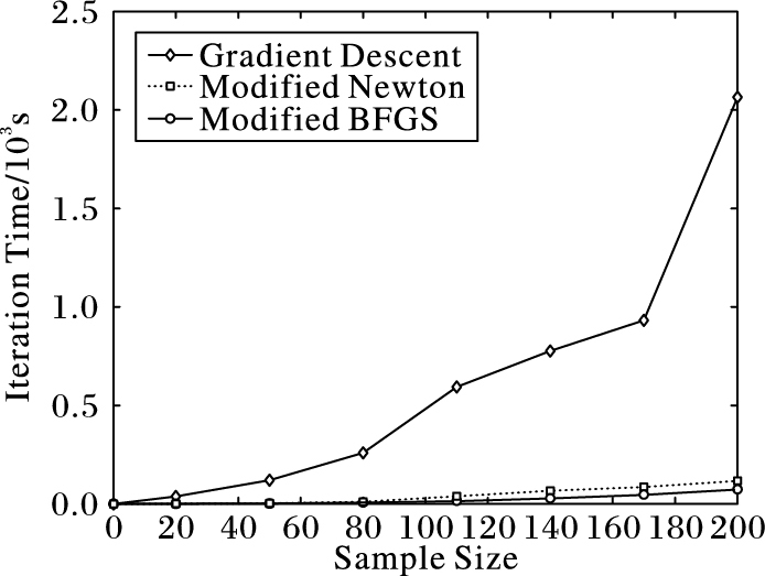 从表 1的迭代时间可以看出,在200个样本时,修正的BFGS算法迭代时间只有72.98s,明显少于梯度下降法的2065.22s和修正牛顿法的116.34s,具有较好的表现。