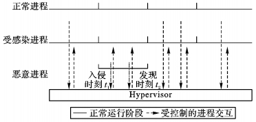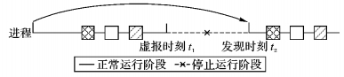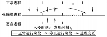 图 3中的横轴代表进程的状态, 实线表示正在运行, 虚线表示暂停。将系统中的进程分成三类, 分别是正常进程、受感染进程和恶意进程。一些进程由于和恶意进程存在交互而受到感染。由于t1到t2时刻内, 恶意进程已经对系统造成实质性影响, 因此需要暂停一段时间进行系统恢复。在这段时间内, 正常进程和受感染进程均处于暂停状态, 系统可用性受到影响。