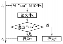方案1 在该进程不知情的情况下控制该进程, 使其不执行真正影响系统的行为, 即行为1和行为2, 而其他行为都正常执行。在虚报被发现时, 只重新执行受控行为, 即行为1和行为2, 其他行为不用重新执行。此方案在性能上具有优势, 但是在通用性方面存在局限性。影响系统的行为往往存在一些后续效果, 即, 这些行为不是独立存在的。例如, 行为1本应在t1时刻执行, 但此时控制它在t1时刻不执行, 而在之后的t2时刻执行, 这样可能会出现状态出错的问题, 因为t1时刻是否成功完成该行为可能会影响到后续的运行状态。如图 5的情况:t1时刻是否成功将“aaa”写入文件x, 决定了t2时刻执行行为α或是行为β。这说明后续运行状态受到该行为影响。