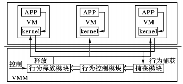 3 系统实现整体系统结构如图 6。本系统将云平台分为两部分:一部分是云平台之上的客户机;另一部分是虚拟化架构中的VMM。本系统在VMM层中添加捕获模块、行为控制模块、行为释放模块, 不对客户机作任何更改。