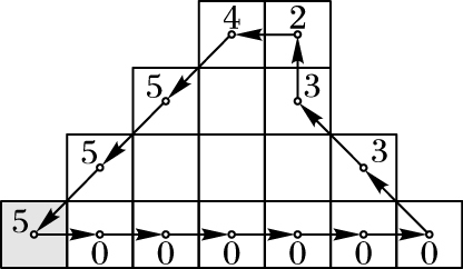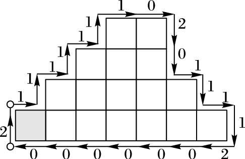 1.2 改进的3OT链码2009年,Sánchez-Cruz等[7]基于3OT链码提出了基于算数编码的正交3方向链码(Arithmetic coding applied to 3OT chain code, Arith_3OT)。Arith_3OT的码值由Σ(Arith_3OT)={σ|0, 1, 2, 3, 4, 5}组成,码值0、1、2与3OT的相同,新增的码值3、4、5是基于码值方向的统计,码值3与码值4分别表示5个连续的码值0和1,码值5表示连续的3OT码值0110组合。