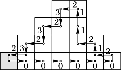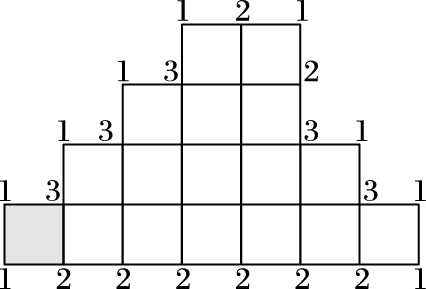 1999年,Bribiesca[2]提出了目前使用非常广泛的顶点链码(Vertex Chain Code, VCC)。与Freeman链码不同,VCC是通过标记图像边界轮廓像素的顶点数目表示的。VCC的码值由Σ(VCC)={σ|1, 2, 3}组成,码值1表示单独的像素顶点,通常在边界像素处出现;码值2表示连续的两个像素顶点,用来表示连续的像素;码值3表示将有3个像素顶点聚集在一起,常在边界像素方向改变处出现,如图 3所示。
