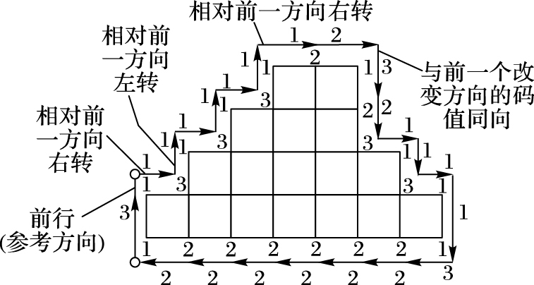 正交3方向链码(OrThogonal 3-direction chain code, 3OT)[3]的码值由Σ(3OT)={σ|0, 1, 2}组成。其中:码值0表示后继链码与前续链码码值方向相同;码值1表示链码前进方向发生改变,同时与其前续相邻的链码码值改变的变化方向不同;码值2表示链码前进方向发生改变,但与其前续相邻的链码码值改变的变化方向相同。如图 4所示。