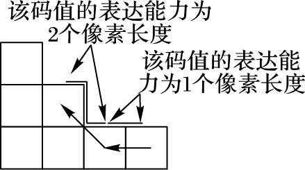 8DFCC链码中码值0、2、4、6的表达能力为1个像素长度;码值1、3、5、7的表达能力为2个像素长度。4DFCC和VCC的所有码值表达能力均为1个像素长度。