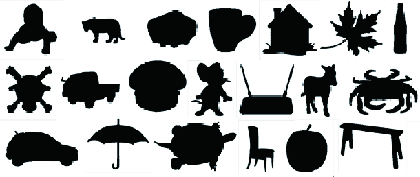进一步检验IO3DVCC的压缩效果,从100幅图像样本中随机抽取20幅,将IO3DVCC与上述链码效率较高的Arith_3OT和ICVCC以8DFCC为基准进行比较。所选的20幅图像轮廓边界如图 7所示。各图像的尺寸如表 6所示。针对这20幅图像,分别统计这四种链码相对每幅图像轮廓的总码数和所占二进制总数,以及相对于8DFCC的压缩比率,如表 7所示。