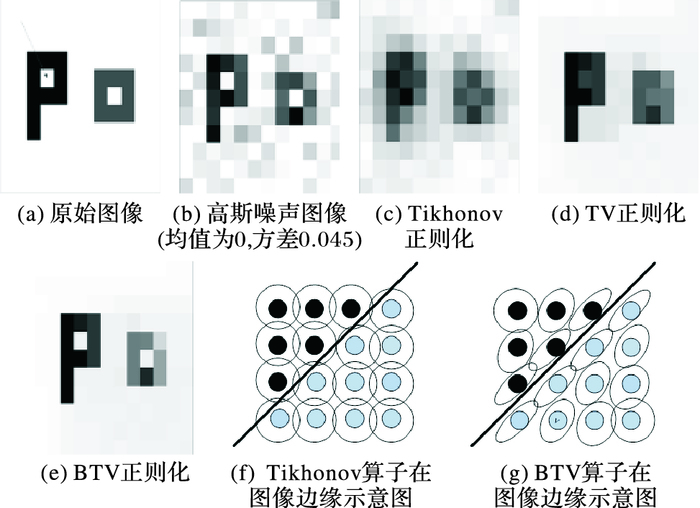 从图 2的结果中可以看出, BTV正则化的方法要明显优于Tikhonov正则化和TV正则化的方法。为了进一步说明BTV算子保持图像边缘的优势,图 2(f)、(g)是Tikhonov正则化(Laplacian算子)和BTV正则化在图像边缘数据的选择示意图,可以明显看到前者无论在图像平滑部分还是在边缘部分都保持相同的处理(如图 2(f)中空心大圆圈所示),而BTV正则化在图像边缘部分(图 2(g)中斜线所示)具有更好的边缘保持能力,它会沿着边缘方向选取算子的大小(如右图中倾斜椭圆所示),从而选择合适的数据用于边缘像素的正则化求解,因此在去除图像噪声的同时更好地保持了边缘细节信息。