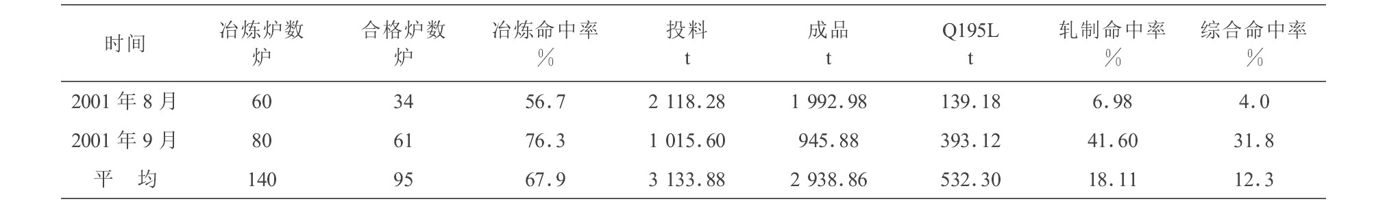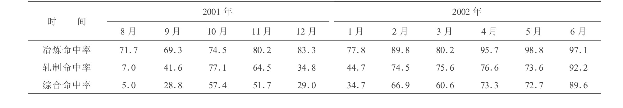 表 9 2001年8月~2002年6月冶炼、轧制及综合命中率, % |